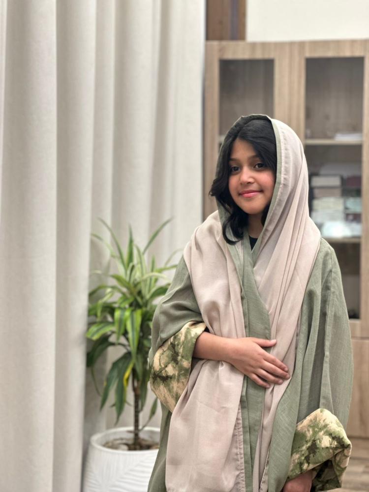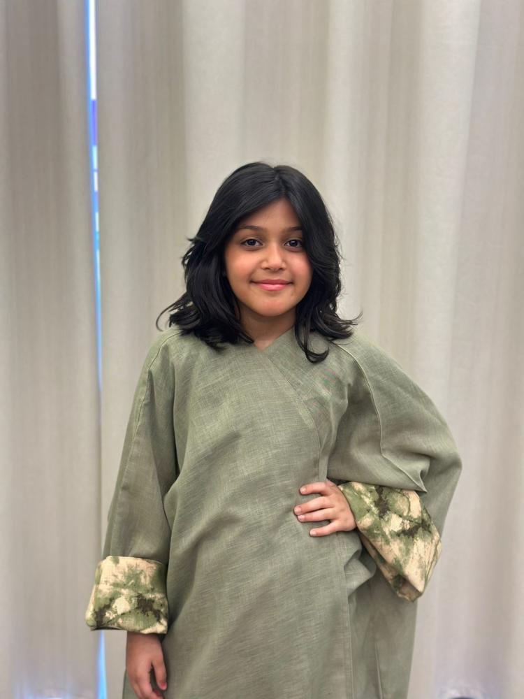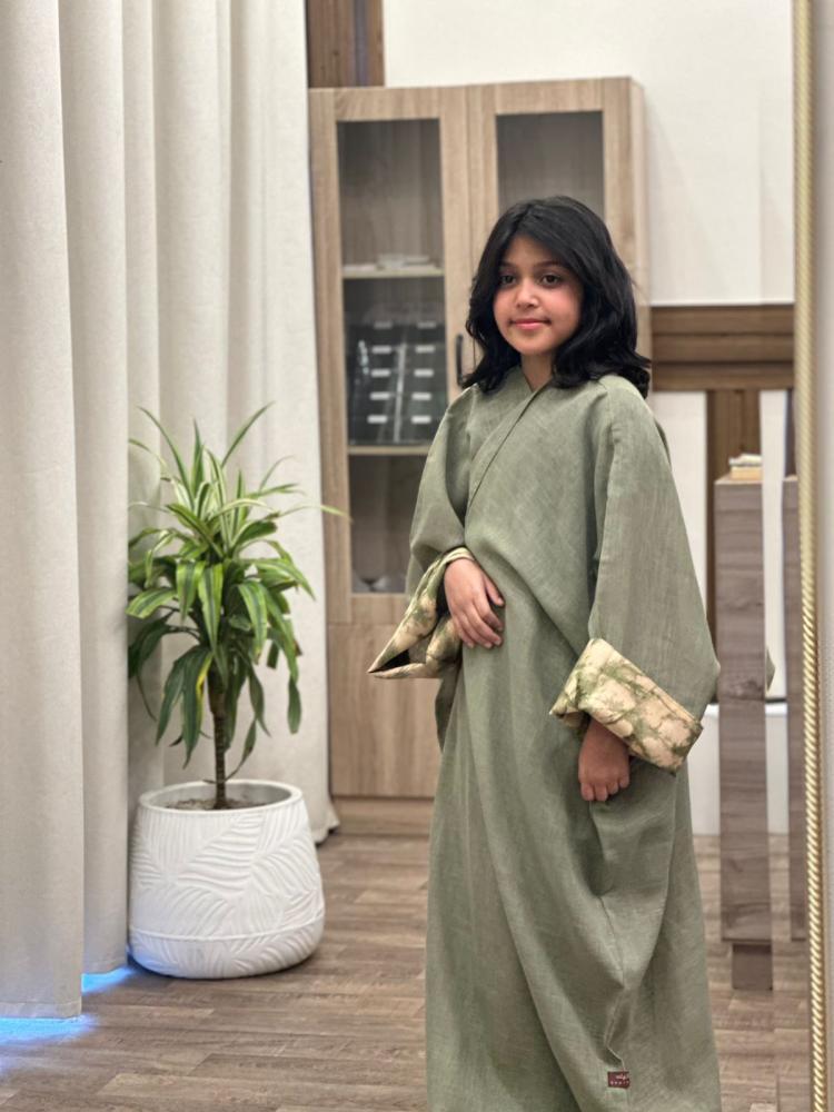 عباية قرين روز من ضمن عبايات اطفال بنات تجمع بين الأصالة والراحة بتصميم خليجي فضفاض يناسب البنات الصغيرات اللون الأخضر الزيتي الهادئ مع نقوش البيج يضفي طابعًا ناعمًا وراقيًا. قطعة مثالية للّعب والمناسبات تُظهر أناقة تقليدية مع لمسة عصرية لطيفة.