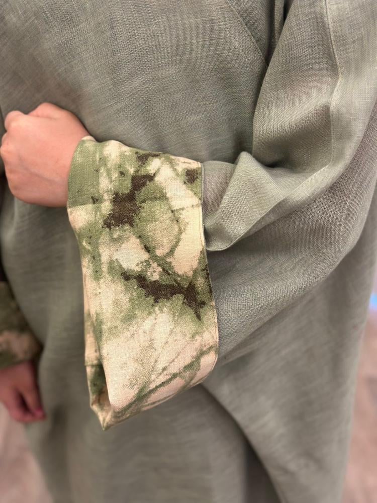 - أكمام واسعة ومطوية بنقشة مميزة باللونين الأخضر والبيج تضيف طابعاً تقليدياً مع لمسة عصرية تلفت الأنظار عند كل ظهور وتجعل الزي مناسبًا للّعب والاحتفالات الصيفية.