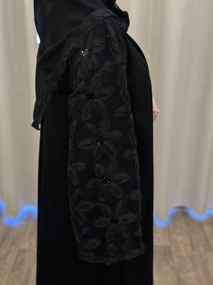 عباية بـ اللون الأسود من خامة الكريب . قصة العباية على شكل نصف كلوش . مزينة بداتتيل الاسود المورد على الاكمام و الطرحه تصاحبها طرحة سوداء