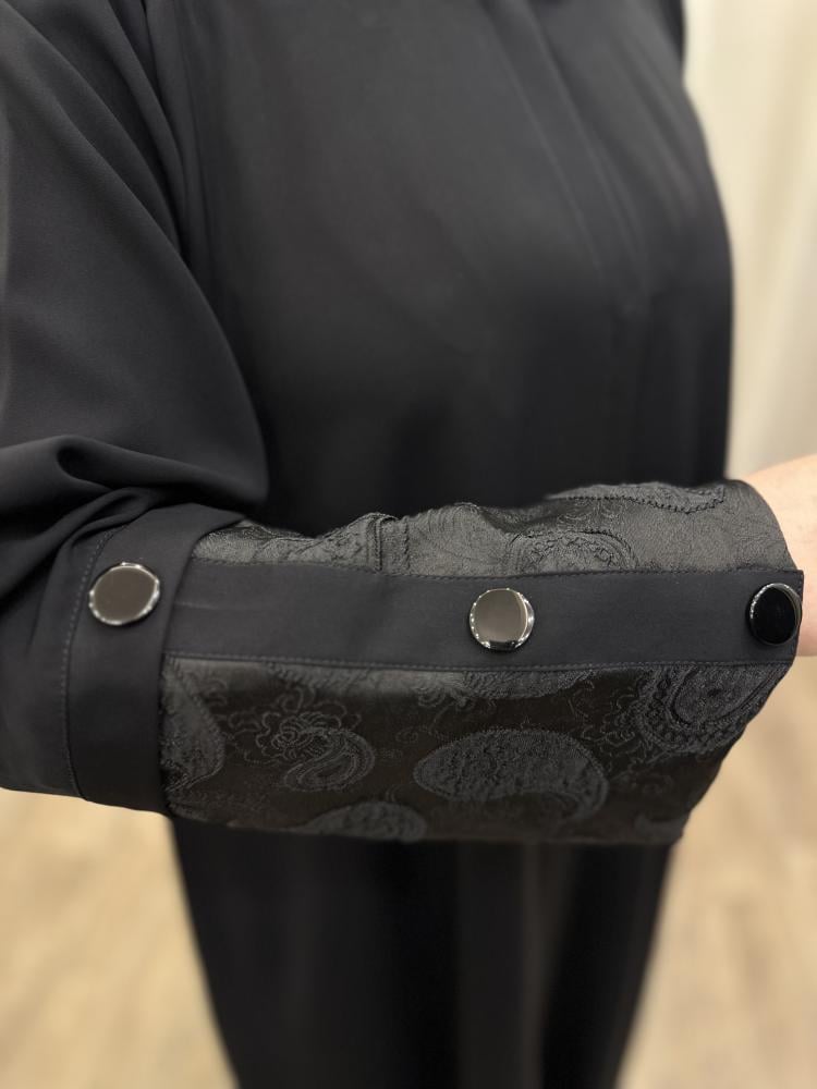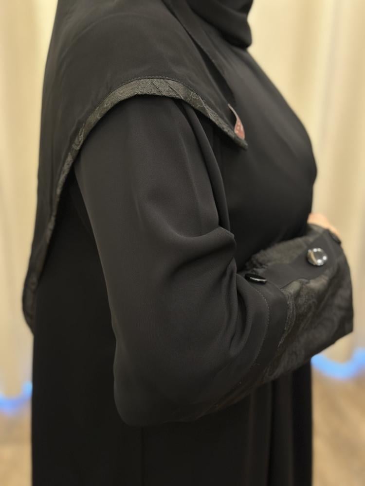 عباية بـ اللون الأسود . قصة العباية على شكل نصف كلوش . مزينه بالجاكار والازارير باللون الاسود على الاكمام و الطرحه و تصاحبها طرحة سوداء