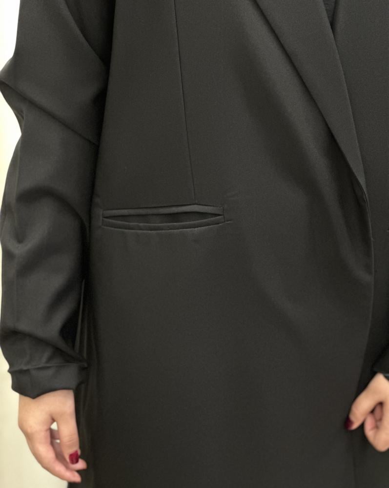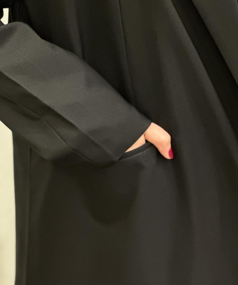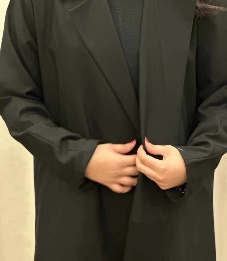 عباية محاكه من الكريب الملكي بقصة البليزر ومبطن بقماش الحرير باللون التايقر .