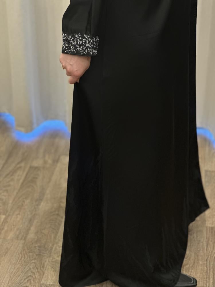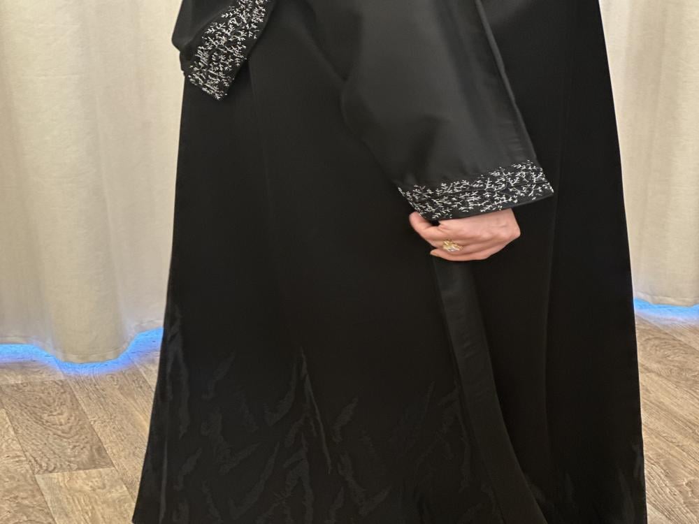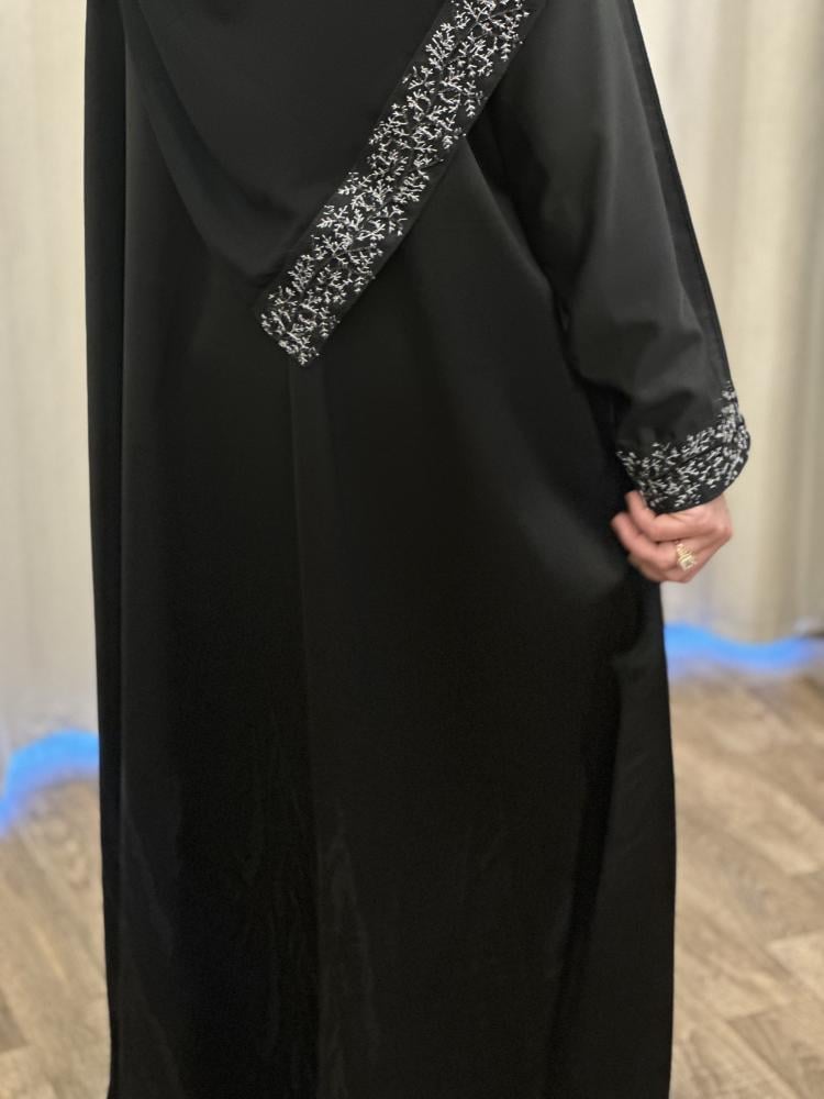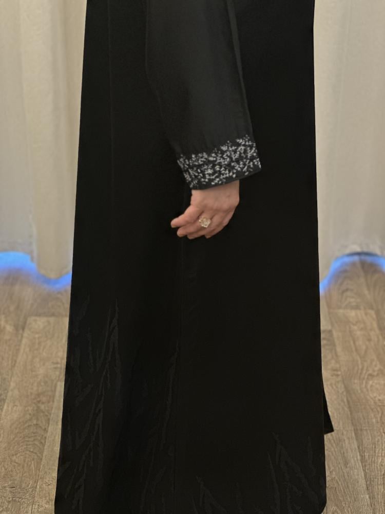 عباية بـ اللون الأسود من خامة الكريب . قصة العباية على شكل نصف كلوش . مزينة بداتتيل الاسود والابيض على الاكمام و الطرحه تصاحبها طرحة سوداء