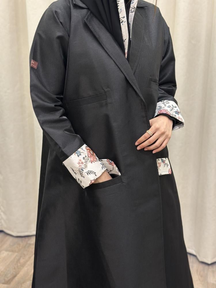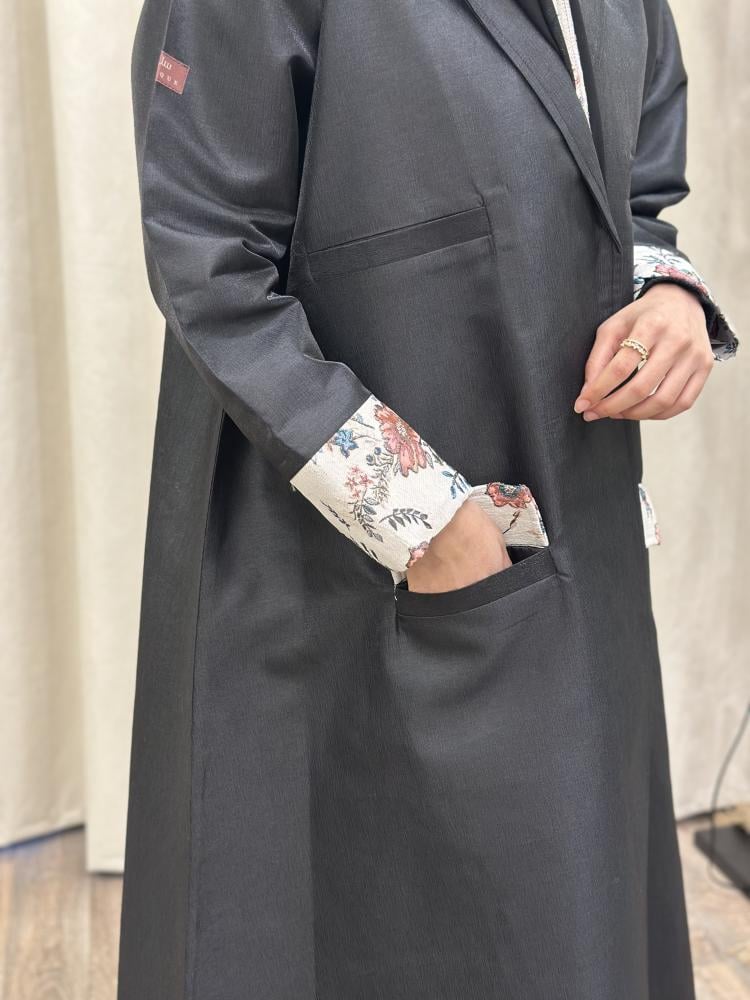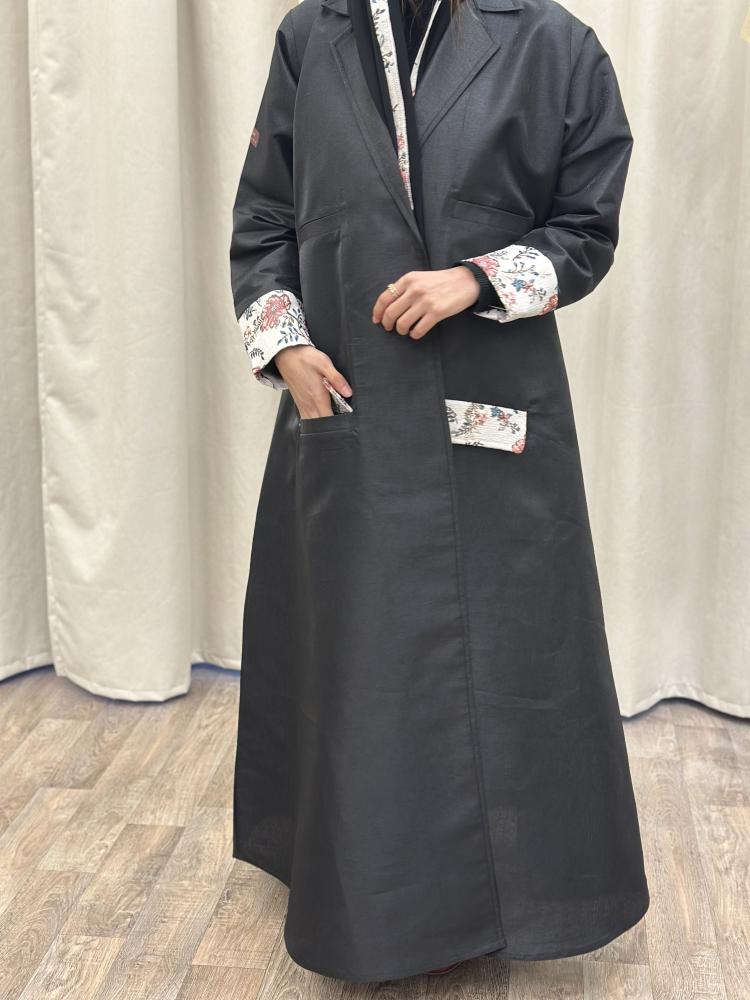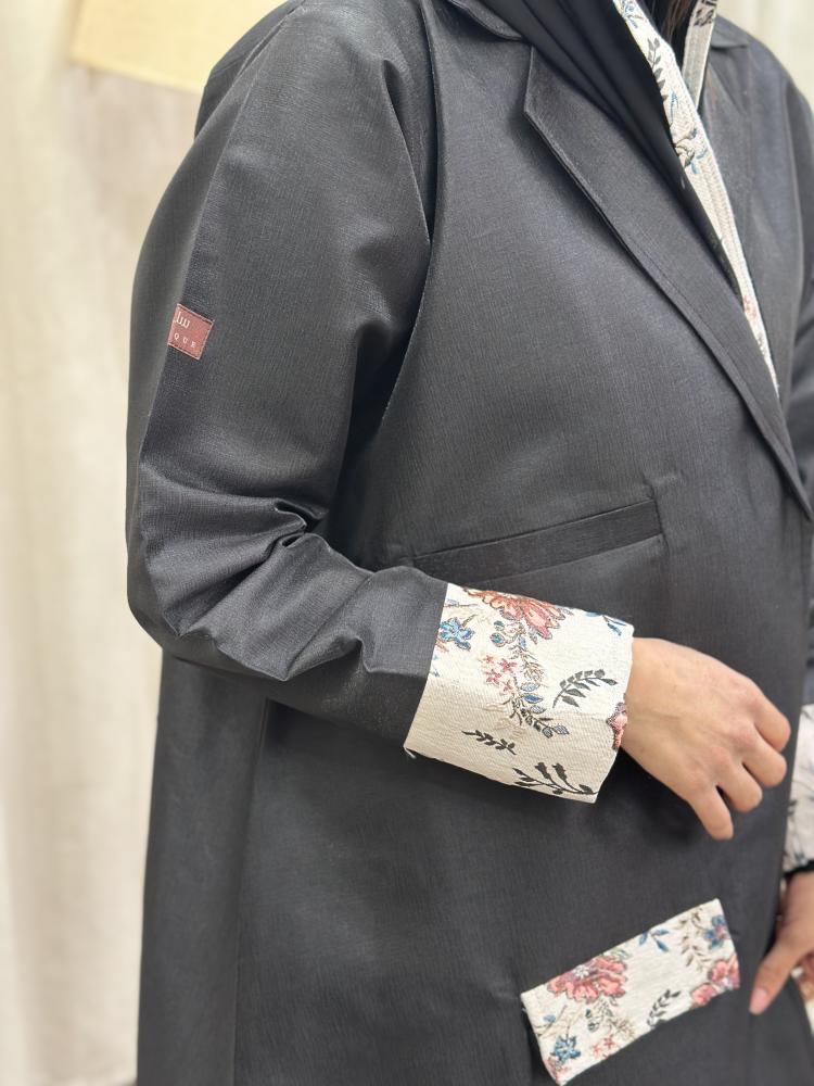 عباية محاكه بتفته روسي مطفي بقصة بليزر بأكمام جاكار مورد أنيقة وعمليه.